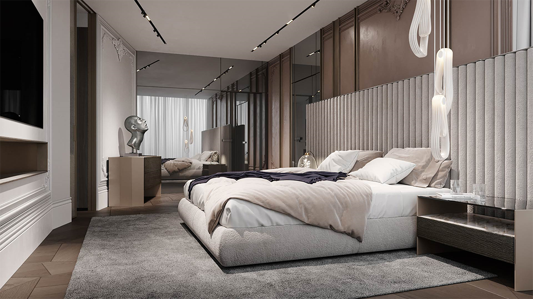 臥室則采用暖色系,金屬裝飾搭配上溫柔的軟裝,藝術(shù)氣質(zhì)的床頭吊燈更加展現(xiàn)出空間的質(zhì)感魅力。